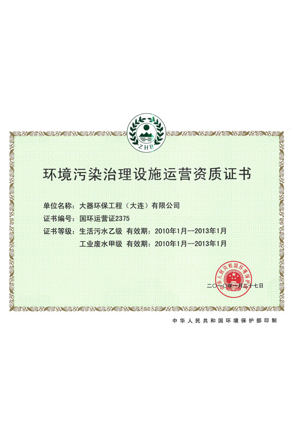 獲得環(huán)境污染治理設(shè)施運(yùn)營資質(zhì)(生活污水乙級 工業(yè)廢水 乙級)