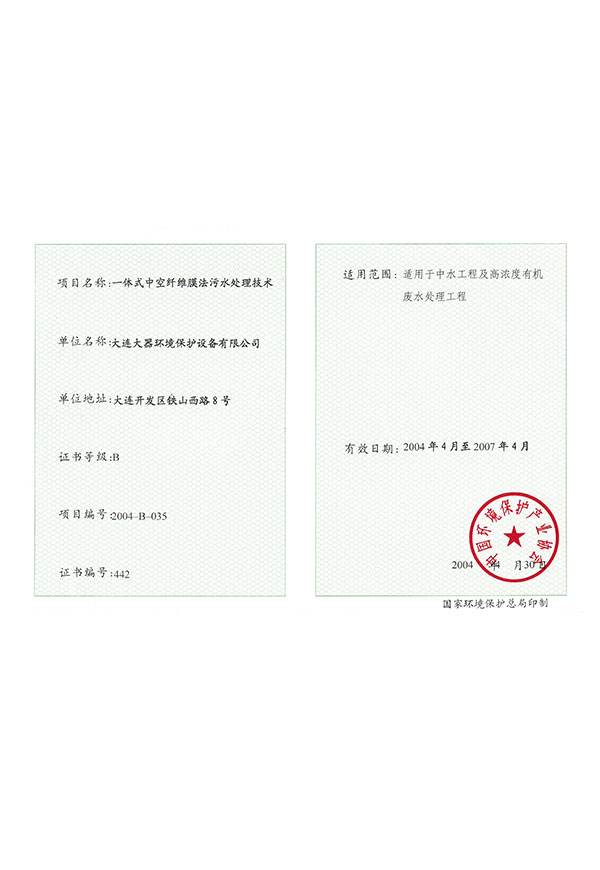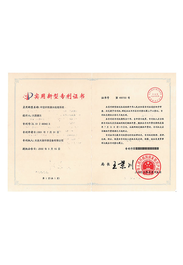 一體式中空纖維膜實(shí)用技術(shù)證書